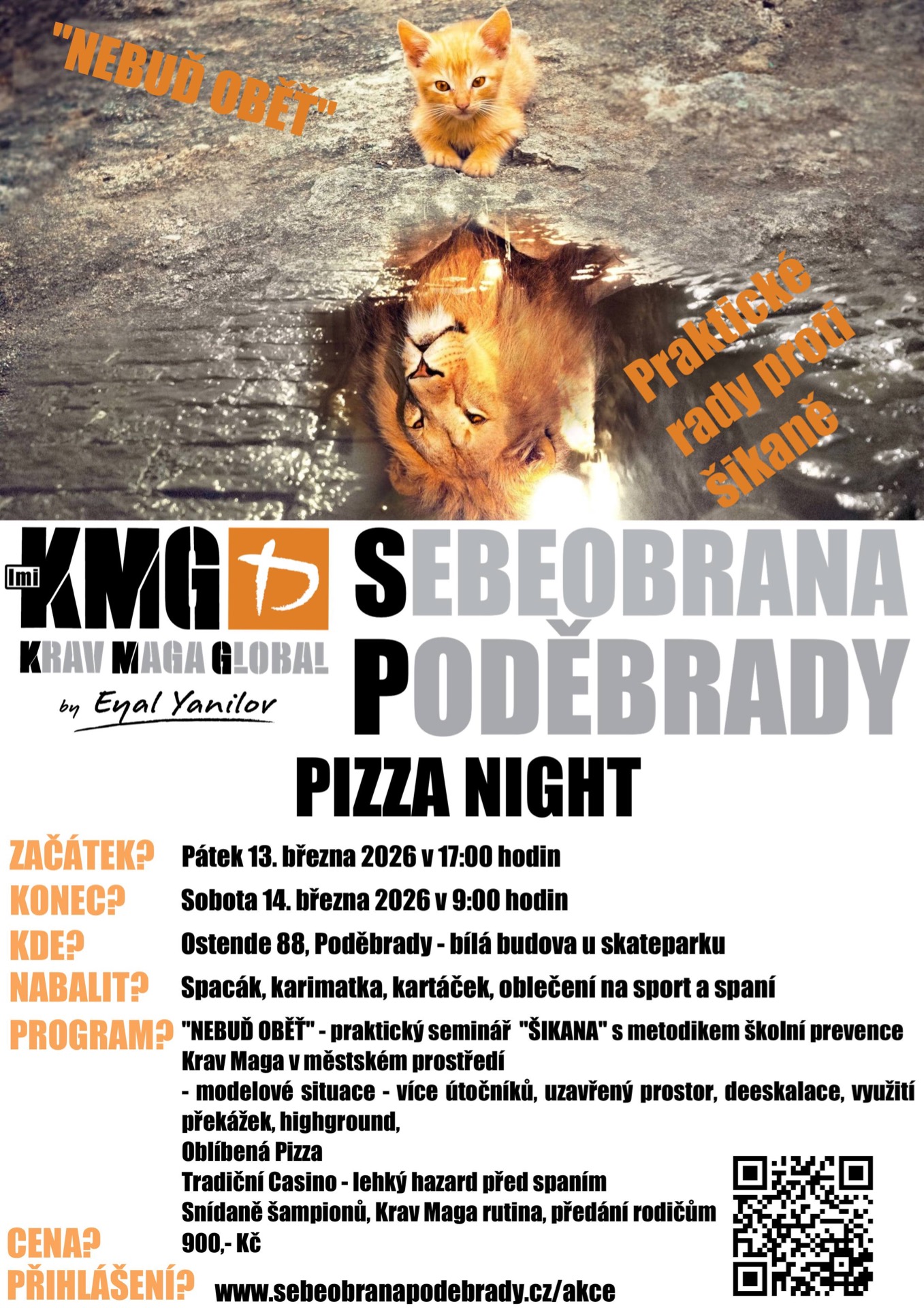 Naše legendární přespání s Krav Maga v nočním městském prostředí. Šikana verbální, fyzická, skupinová, byla je a bude. Je to patologický jev se kterým se potýkají naše děti dnes a budou i v dospělosti. Existují ale postupy, jak snížit riziko šikany a její dopady na člověka. Pro studenty je připraven interaktivní seminář s praktickým nácvikem jednoduchých postupů do života. Vždy je dobré mít v záloze plán B - Krav Maga. Na večer máme také připraveny modelové situace v přirozeném prostředí nočního města, pizzu a spousty legrace před spaním.